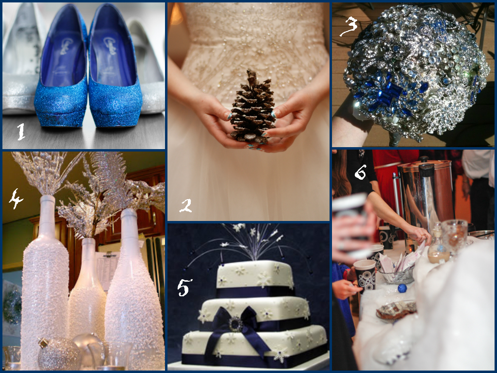 Whoo! Theme Thursdays! I have been looking forward to this one! Today I am listing what, in my opinion, are must haves for a Sparkling Winter Wonderland Wedding in blue and silver. This theme holds a special place in my heart because it was the theme I had at my wedding. In fact most of the photos in the collage I’m posting below come directly from my own day! So anyways. Without further adieu! Must haves!